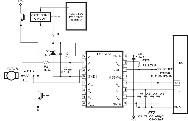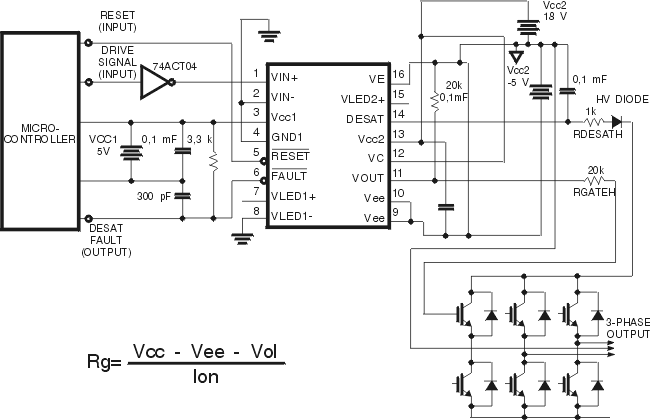- драйвер для прямого управления IGBT транзисторами с током коллектора 150 А, напряжением коллектор - эмиттер 1200 В; выходной ток 2 А ( импульсный ток до 2,5 А ), управляющее напряжение от 15 до 30 Вольт. Прибор собран в корпусе SO -16 ( HCPL 316J ), схема управления мощным двигателем от трехфазной сети приведена на рис.4.