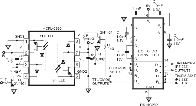 - изолированный полный двунаправленный интерфейс RC - 232 - E со скоростью до 1 Mbit | s , входным током 16 мА , напряжением изоляции 2, 5 к V, в корпусе SO 8 ( HCPL 0560 ). На рис.2 приведена рекомендуемая схема применения такого прибора.