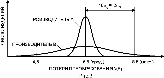 Для пояснения данной методики оценки повторяемости параметров изделий рассмотрим пример, приведенный на рис.2. Предположим, что два производителя A и B выпускают в равных количествах смесители частот с одинаковыми величинами потерь преобразования: 6,5 дБ (сред.), 8,5 дБ (макс.) При этом производитель A обеспечивает своих клиентов изделиями со стандартным отклонением 0,2 дБ (разница между заданным пределом 8,5 дБ и средним значением 6,5 дБ составляет 10sA). Изделия же, выпускаемые производителем B, имеют величину стандартного отклонения 1 дБ (соответственно, разница между заданным пределом 8,5 дБ и средним значением 6,5 дБ составляет 2sB). Очевидно, что технологический процесс у производителя A настроен лучше, повторяемость параметров его изделий выше, а брака меньше, чем у производителя B.