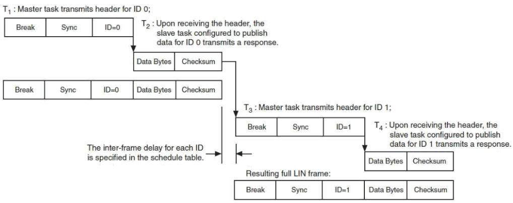 Шина LIN является системой опросного типа, состоящей из единственного ведущего устройства и одного или нескольких ведомых. Ведущее устройство содержит задачи ведущего и ведомого, в то время как каждое ведомое устройство только задачу ведомого. Коммуникация по шине LIN полностью управляется задачей ведущего в ведущем устройстве. Основным блоком передачи данных по шине служит кадр, состоящий из заголовка и ответного сигнала ведомого устройства. Заголовок всегда передаётся ведущим устройством и включает три поля: синхропауза (break), поле синхронизации (sync) и идентификатор (ID). Ответ посылается задачей ведомого, которая может находиться как в ведущем, так и в ведомом устройстве, и содержит полезные данные и контрольную сумму.
